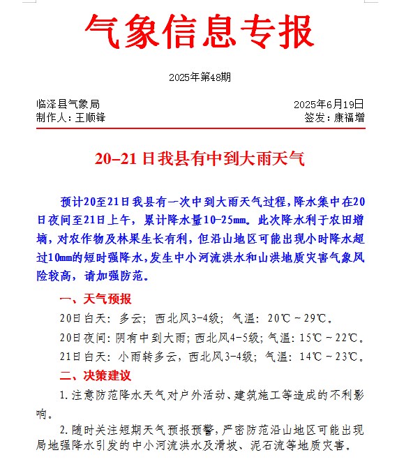 2025年6月19日氣象信息專報(第48期)-20-21日我縣有中到大雨天氣