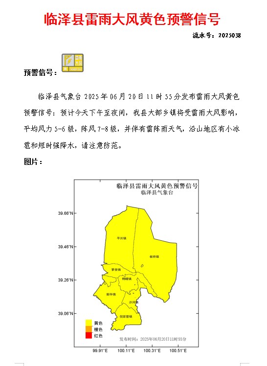 臨澤縣氣象臺2025年06月20日11時55分發(fā)布雷雨大風黃色預警信號(發(fā)布)