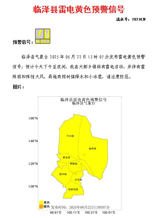 臨澤縣氣象臺2025年06月22日13時07分發布雷電黃色預警信號(發布)