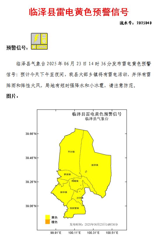 臨澤縣氣象臺(tái)2025年06月23日14時(shí)36分發(fā)布雷電黃色預(yù)警信號(hào)(發(fā)布)