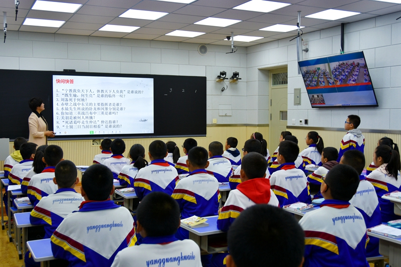 “農場小學丁同學用方程求解的思路很獨特,加一顆星,濱河小學的同學做得也不錯,加一顆星。”在新華農場小學,學生們看著屏幕上濱河小學教師同步講授數學課,現場助教教師在一旁維持上課秩序,并與主教配合默契地開展教學。不同的學校,不同的教室,相同的教師,相同的學習內容,一個課堂,兩塊大屏,通過信息化手段實現課堂教學城鄉異地同步直播。“校連校”的“專遞課堂”實現了優質教育資源共享,促進了城鄉教育公平和均衡發展。