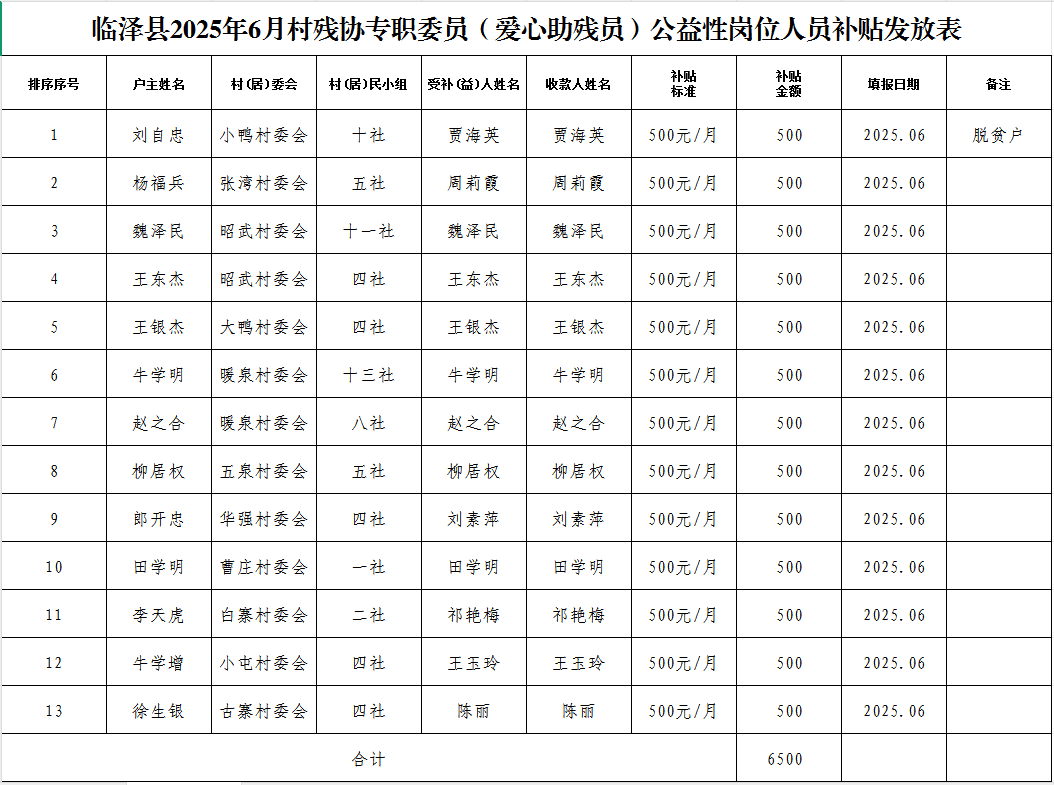 臨澤縣2025年6月村殘協(xié)專職委員(愛心助殘員)公益性崗位人員補貼發(fā)放表