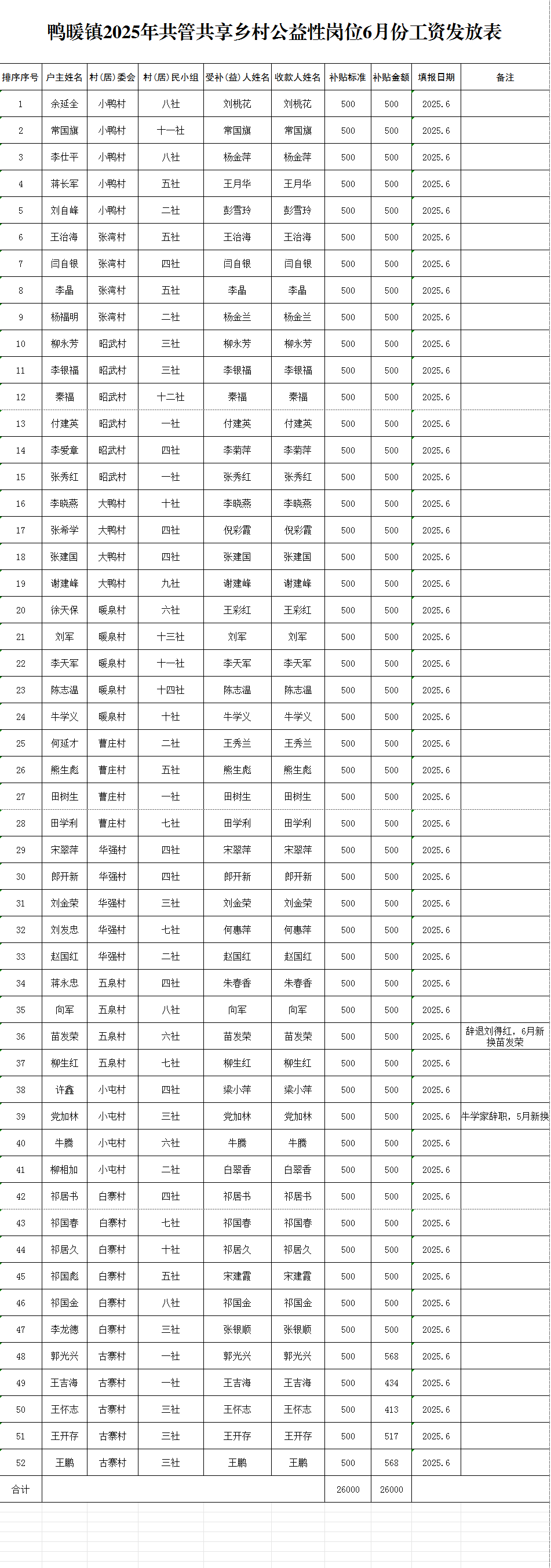 鴨暖鎮2025年共管共享鄉村公益性崗位6月份工資發放表