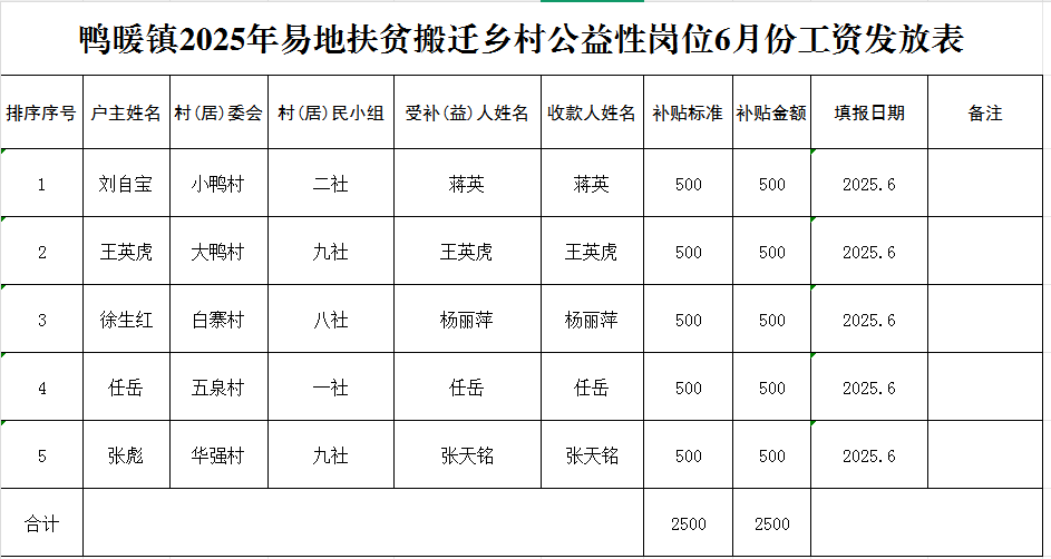 鴨暖鎮2025年易地扶貧搬遷鄉村公益性崗位6月份工資發放表